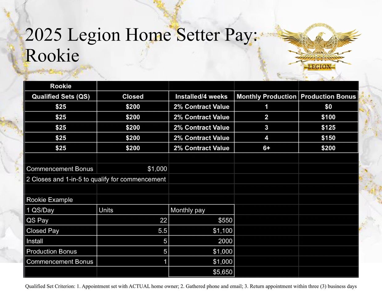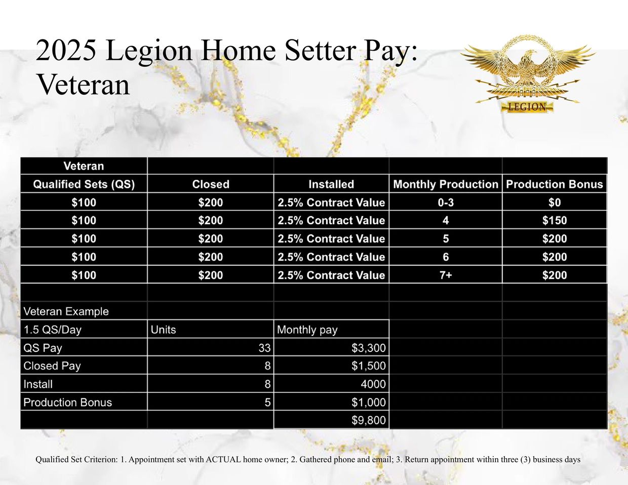 Therefore, if a setter sets an appointment that meets our qualified set criterion, you will be paid THAT NIGHT, regardless if the appointment closes or not.